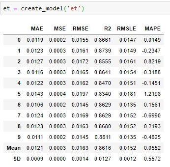 I would also create a base Extra Tree (et) model since its original performance (before tuning ) was very close to tuned knn. We will use the create_model() function in PyCaret to create the model.