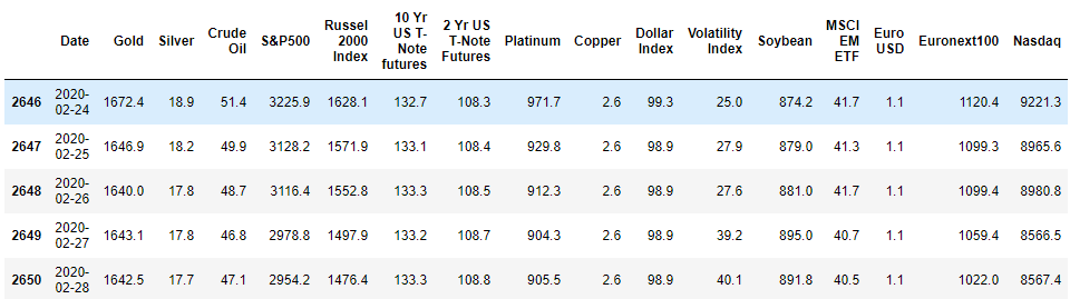Once we have the date range in dataframe, we need to use ticker symbols to pull out data from the API. ***yahoofinancials ***returns the output in a JSON format. The following code loops over the the list of ticker symbols and extracts just the closing prices for all the historical dates and adds them to the dataframe horizontally merging on the date. Given these asset classes might have different regional and trading holidays, the date ranges for every data pull might not be the same. By merging, we will eventually have several NAs which we will frontfill later on.