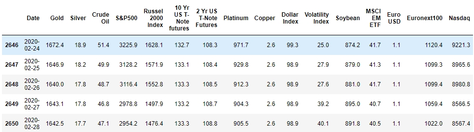 imp = [‘Gold’,’Silver’, ‘Crude Oil’, ‘S&P500’,’MSCI EM ETF’]