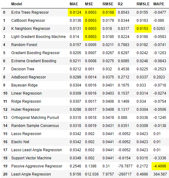 In the code above, dataset passed as ‘data_22’ and target is pointed to the column labeled ‘Gold-T+22’. I have specifically mentioned ‘Date’ column to be ignored so as to prevent PyCaret to create time based features on the date column, which might be very helpful in other cases, but we are not evaluating that now. If you want to see the distribution and correlation between variables, you can keep the argument ‘profile=True’, which displays a panda profiler output. I have intentionally provided ‘session_id=11’ to be able to recreate the results.