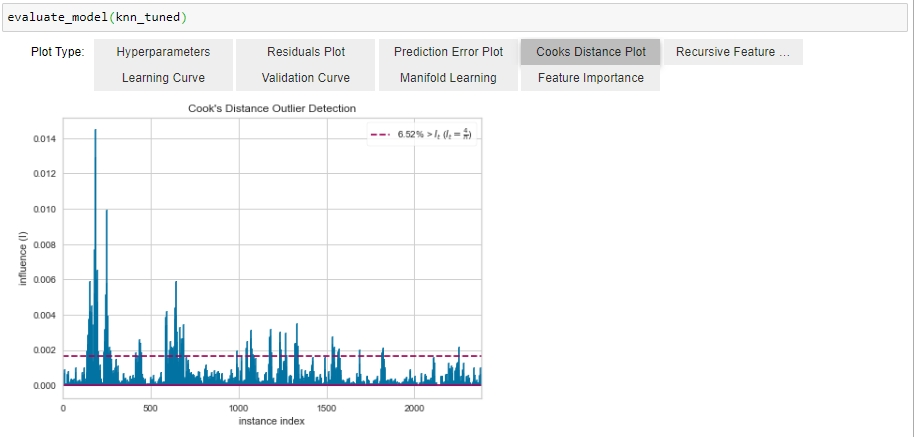 It is important to conduct some model diagnostics on trained models. We will use the ***evaluate_model() ***function in PyCaret to see collection of plots and other diagnostics. It takes in a trained model to return selection of model diagnostic plots and model definitions. We would do do model diagnostics on both of our top models i.e knn_tuned and et.