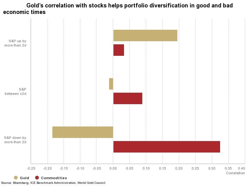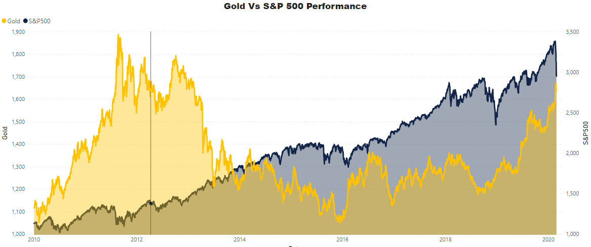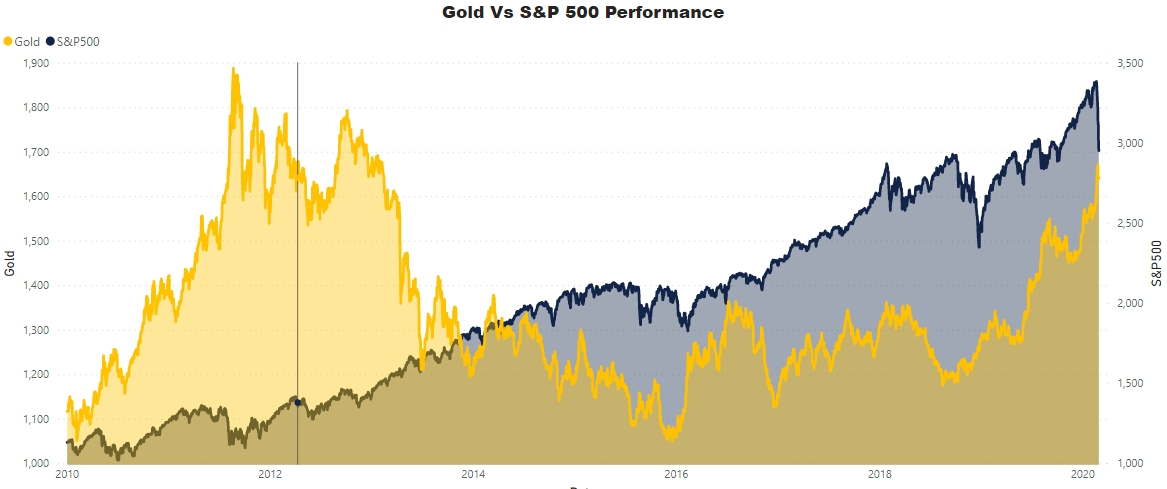 We can see above that Gold exhibits negative correlation when S&P500 has an extreme negative movement. Recent sharp fall in stock markets also highlights a similar relationship when Gold rose in anticipation of the fall recording 11% gain YTD compared to 11% YTD loss for S&P500.