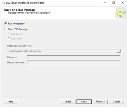 Click the Finish button to run the package
