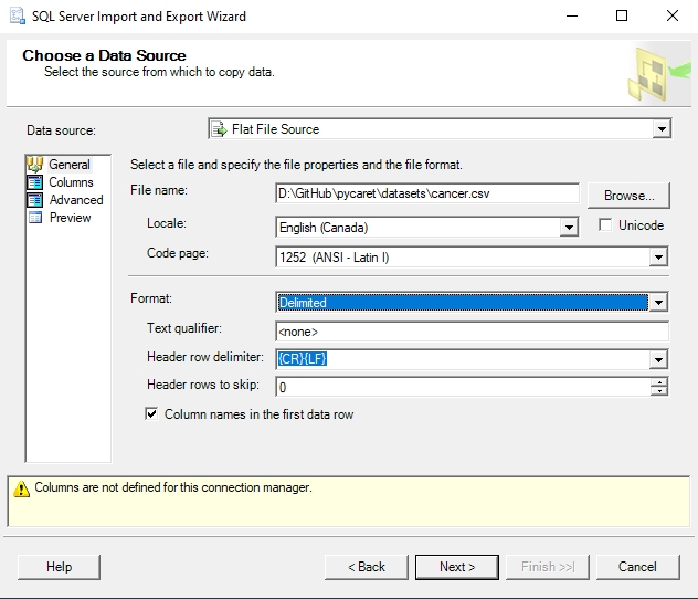 For Data Source, select Flat File Source. Then use the Browse button to select the CSV file. Spend some time configuring the data import before clicking the **Next **button.