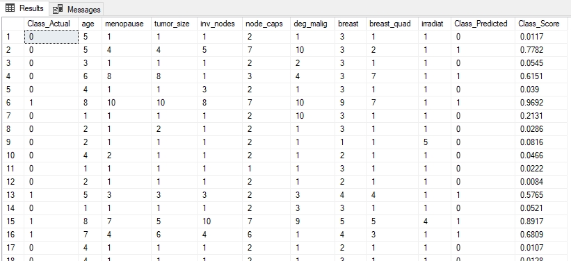 EXEC pycaret_predict_cancer 2, 'cancer', 'Extra Trees Classifier algorithm';iv. Execute the SQL below to view the result of the prediction