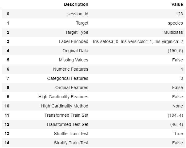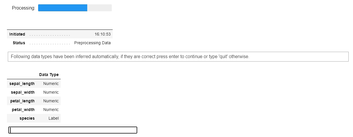 Whenever you initialize the setup function in PyCaret, it profiles the dataset and infers the data types for all input features. In this case, you can see all the four features (sepal_length, sepal_width, petal_length, and petal_width) are identified correctly as Numeric datatype. You can press enter to continue.