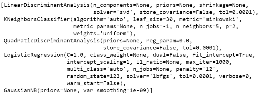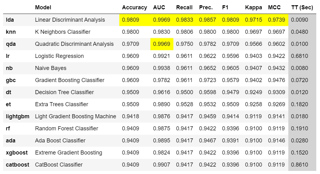 The output of this function is a table showing the mean cross-validated scores for all the models. The number of folds can be defined using the foldparameter (default = 10 folds). The table is sorted (highest to lowest) by the metric of choice which can be defined using the sortparameter (default = ‘Accuracy’).
