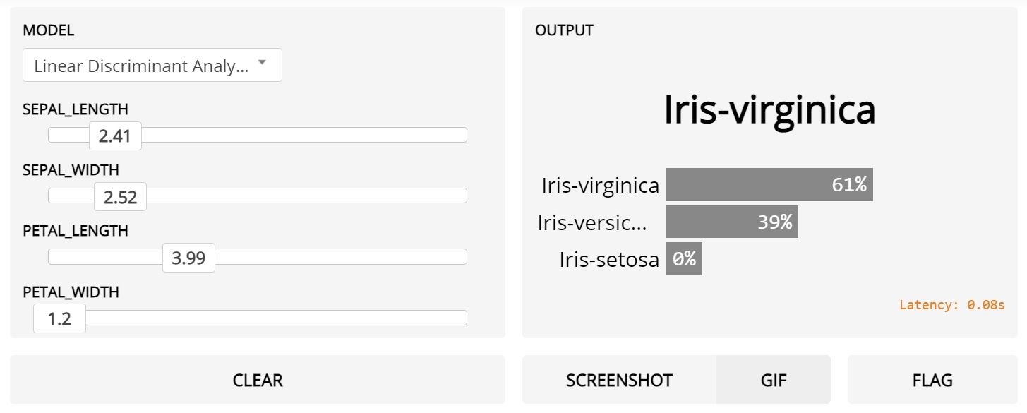 Now that we are done with the modeling process, let’s create a simple UI using Gradio to interact with our models. I will do it in two parts, first I will create a function that will use PyCaret’s predict_model functionality to generate and return predictions and the second part will be feeding that function into Gradio and designing a simple input form for interactivity.