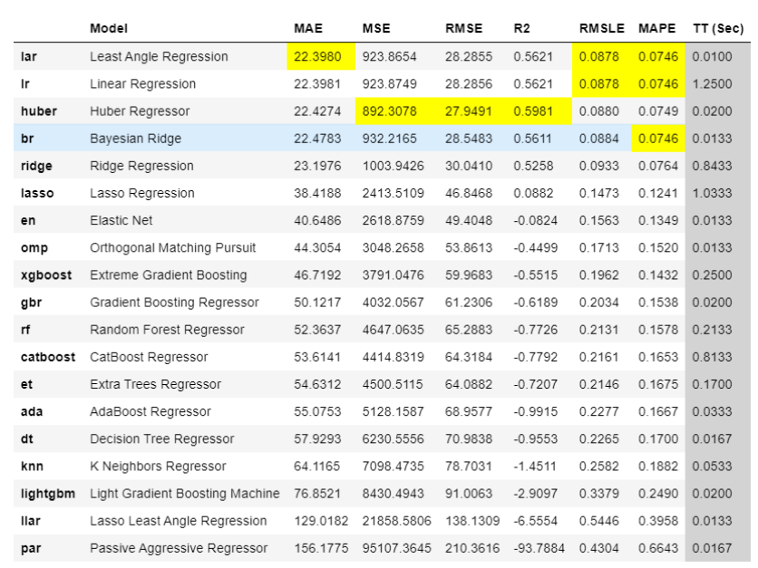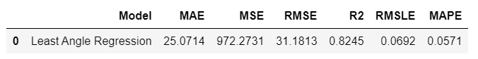 The best model based on cross-validated MAE is **Least Angle Regression **(MAE: 22.3). Let’s check the score on the test set.