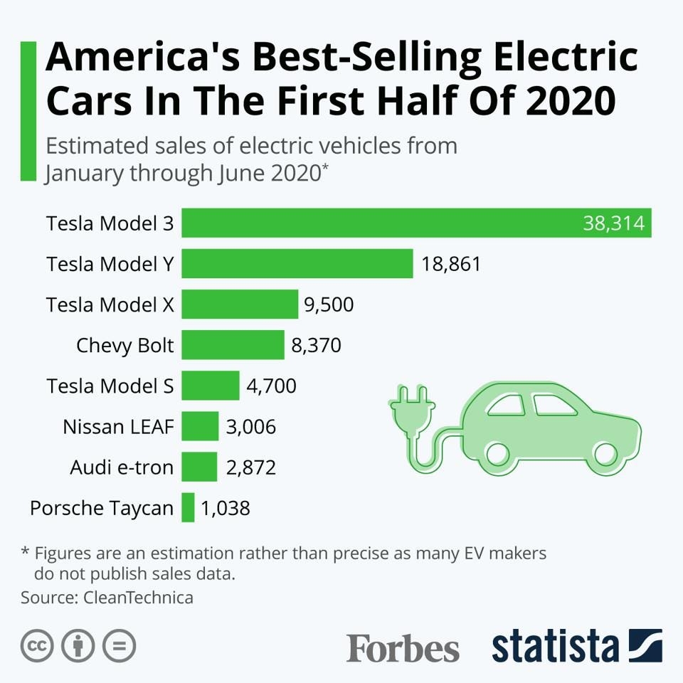 See the example below of a dataset that tracks America’s best-selling electric cars in the first half of 2020. Notice that instead of tracking the cars sold over a period of time, the chart below tracks different cars such as Tesla, Chevy, and Nissan in the same time period.