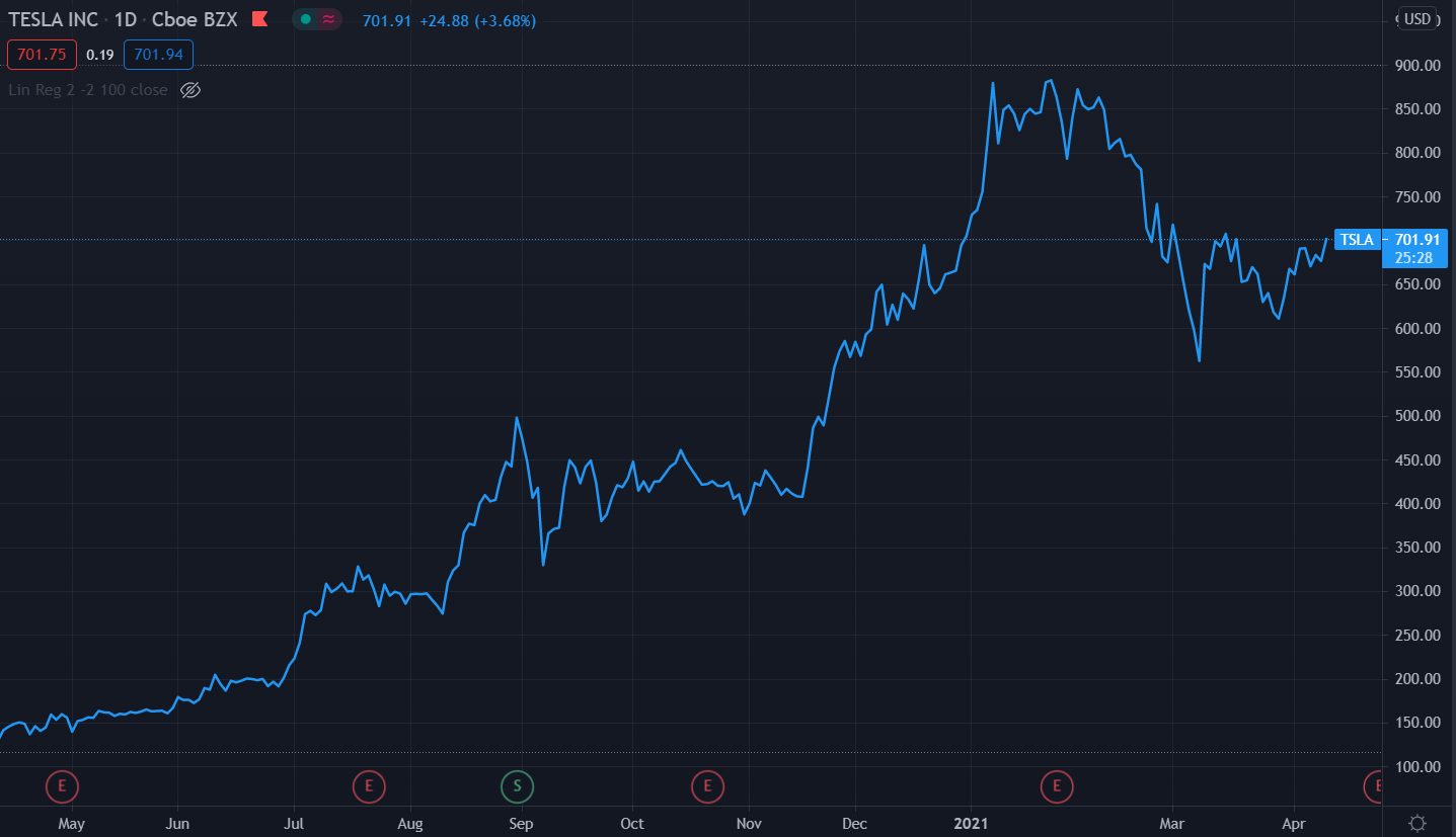See below as an example of time series data, the chart below is the daily stock price of Tesla Inc. (Ticker Symbol: TSLA) for last year. The y-axis on the right-hand side is the value in US$ (The last point on the chart i.e. $701.91 is the latest stock price as of the writing of this article on April 12, 2021).